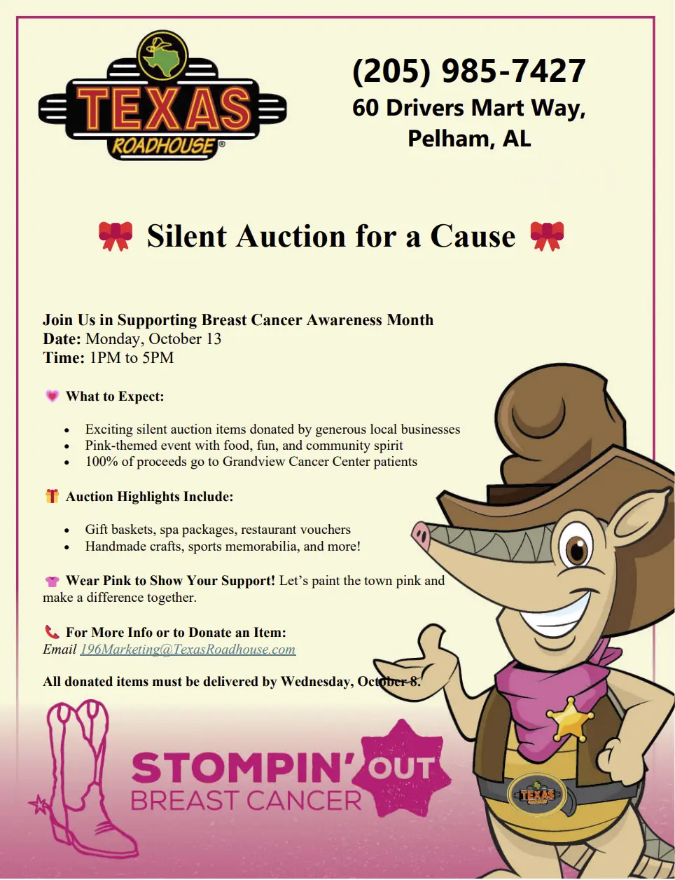 October 13 @ 1:00 pm - 5:00 pm Silent Auction for a Cause Texas Roadhouse - Pelham 60 Drivers Mart Way, Pelham
